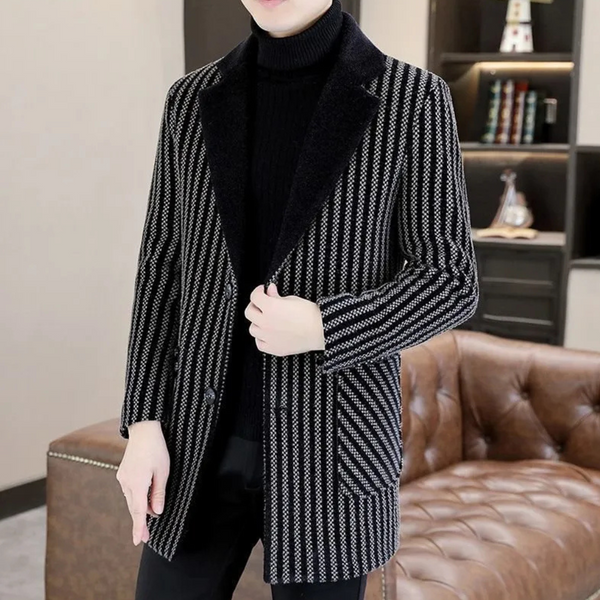 - Veelzijdig ontwerp: De overjas heeft een modern gestreept patroon, waardoor hij een flexibele aanvulling op jouw garderobe is.